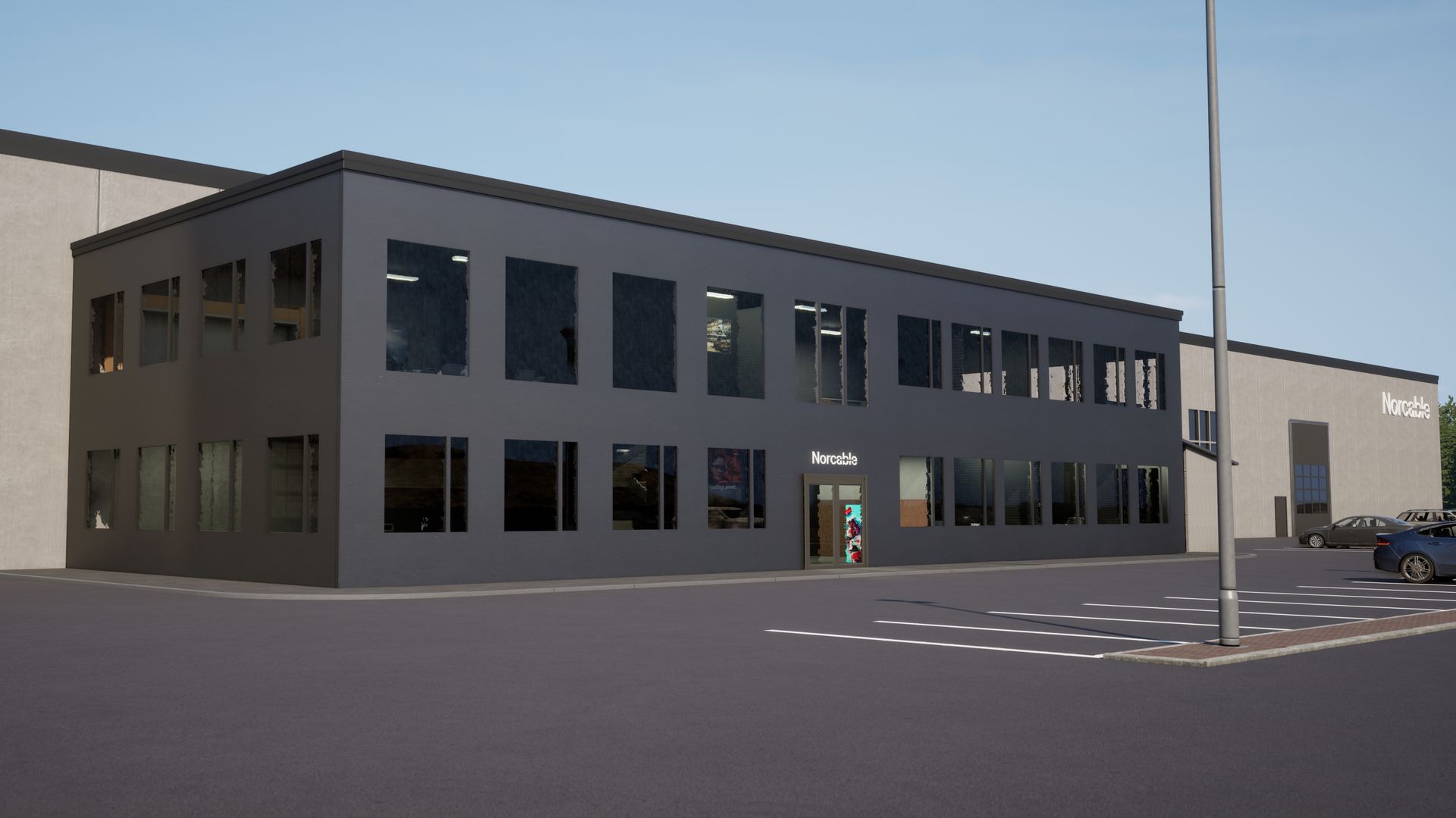 Visualiseringer viser en ny, moderne fabrikk med kontor og produksjon samlet på et sted.